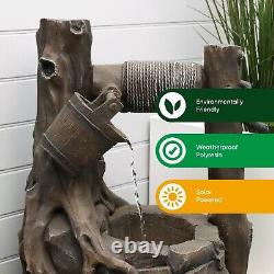 Rustic Brick Well and Tree Trunk Solar Water Fountain. Add a touch of rustic charm to your garden with this elegantly designed water fountain. Featuring a brick well beside a tree trunk, this water feature is perfect for patios, decking, garden areas, and flowerbeds. Its classic design brings a delightful and serene ambiance to any outdoor space.