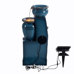 Fontaine décorative d'extérieur à 4 niveaux alimentée par énergie solaire avec une finition bleu brillant et des accents bruns. Les trois niveaux inférieurs sont illuminés par le bas par des lumières LED, alimentées par l'énergie solaire. Les niveaux présentent quatre jars uniques, chacune avec des anneaux décoratifs pour une profondeur supplémentaire.